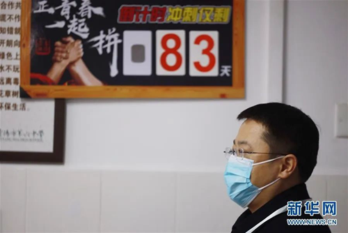 貴陽市第六中學一名高三任課老師在高考倒計時83天的指示牌前。
