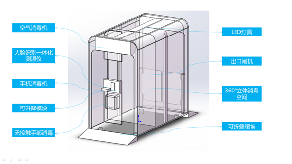 ▶ 360°立體式封閉消毒,空間大,人員及隨身物品可以一并進行消毒。采用次氯酸/過氧化氫等食品級消毒液,健康安全環保衛生;