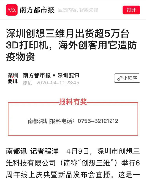 此次,我們借助了全新的直播平臺(tái),更及時(shí)、便捷、近距離的接觸到我們的目標(biāo)用戶。在新品發(fā)布現(xiàn)場(chǎng),創(chuàng)想三維新品3D打印機(jī)和最先進(jìn)的應(yīng)用技術(shù)第一次以這樣的方式及時(shí)地傳遞給了海內(nèi)外用戶。在直播的兩個(gè)多小時(shí)中,公司通過(guò)B站官方賬號(hào),和屏幕另一端的用戶進(jìn)行實(shí)時(shí)互動(dòng)。 創(chuàng)想三維2020年首次大型線上新品發(fā)布活動(dòng),受到了多家主流媒體的關(guān)注。廣東電視臺(tái)、深圳都市頻道、南方都市報(bào)、深圳晚報(bào)、網(wǎng)易新聞、搜狐新聞視頻等權(quán)威媒體持續(xù)跟進(jìn),對(duì)活動(dòng)進(jìn)行了報(bào)道。