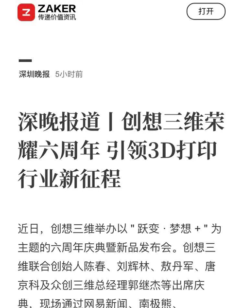最后,感謝各大媒體平臺(tái)對(duì)創(chuàng)想三維的關(guān)注和認(rèn)可。創(chuàng)想三維牢記使命,六年來(lái)風(fēng)雨兼程。在3D打印高科技行業(yè),創(chuàng)想三維始終把研發(fā)和創(chuàng)新當(dāng)成立身之本,樹(shù)立行業(yè)標(biāo)桿,號(hào)召同行一起努力,共同推進(jìn)3D打印產(chǎn)業(yè)的進(jìn)步與發(fā)展。面對(duì)社會(huì)責(zé)任,創(chuàng)想三維第一時(shí)間發(fā)揮專業(yè)優(yōu)勢(shì)投身抗“疫”,彰顯企業(yè)責(zé)任與擔(dān)當(dāng),向全社會(huì)展示了中國(guó)高科技企業(yè)的力量與信心。 以下為創(chuàng)想6周年慶暨新品發(fā)布會(huì),直播回放及相關(guān)報(bào)道,如有錯(cuò)過(guò),可及時(shí)回看。