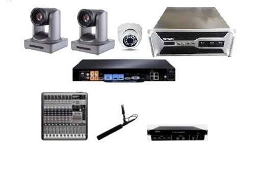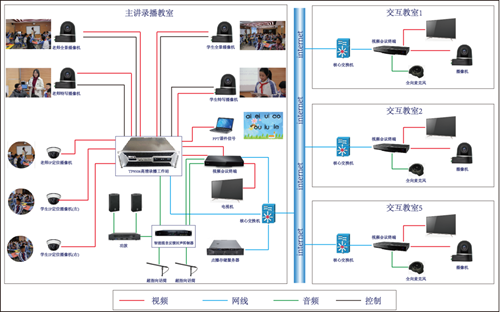多點互動錄播系統具有功能強大,操作簡單,可實現全程無人值守等特點。該系統可支持 1 間全自動錄播教室,與 5 間遠程互動教室協同工作,進行實時視頻交流與錄播教室的課程錄制,系統由 4 臺高清攝像機(2 臺特寫攝像機 2 臺全景攝像機),4-8 組強指向采訪話筒及調音臺,1 臺錄播工作站,1 臺串口服務器及 3 臺圖像定位攝像機,以及視頻會議終端與電視機組成。該系統能夠滿足校內常態課、精品課、微課以及互動課程的錄制工作。
