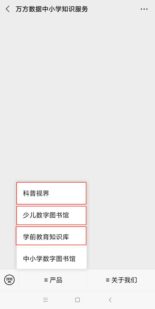 活動期間內(nèi),在微信中搜索到“萬方數(shù)據(jù)中小學(xué)知識服務(wù)”微信公眾號,選擇左下方的“產(chǎn)品”鏈接,點擊選擇“產(chǎn)品”中的“科普視界”“少兒數(shù)字圖書館”“學(xué)前教育知識庫”,即可直接打開進(jìn)行資源的在線閱讀。