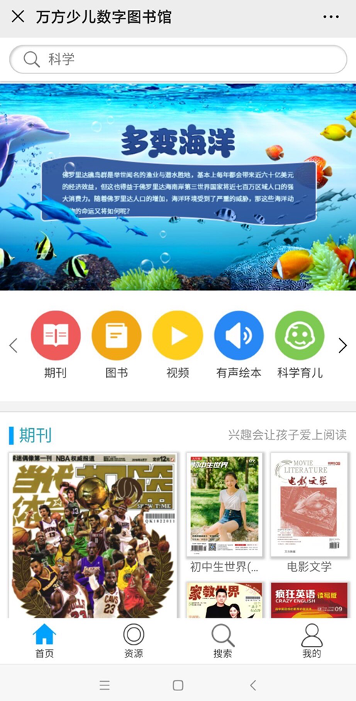 資源包括:優(yōu)質(zhì)的科普視頻資源、精美的有聲繪本、各類豐富的期刊文獻(xiàn)、圖書、視頻。暢游知識海洋,定會收獲多多!