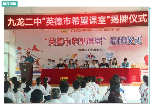 碧桂情系鄉山,科技助力教育。5月7日,英德市九龍鎮第二初級中學隆重舉行了碧桂園集團&國強基金會&云蝶科技全額捐贈的首批“希望教室”揭牌儀式,共同助力英德信息化教育建設。碧桂園·國強公益基金會英德片區營銷總經理陳虹穎、英德項目部經理鄧志鵬、黃利紅;云蝶科技營銷副總裁沈勇;清遠市教育局基信科科長馮志恒;英德市教育局局長張燕輝等領導受邀出席。九龍二中全體教師、九年級學生代表共一百余人一同見證了此次愛與希望的滿滿匯聚。