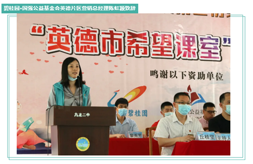 接著碧桂園·國強公益基金會英德片區營銷總經理陳虹穎致辭,她表示碧桂園•國強公益基金將繼續不忘慈善初心,牢記習總書記的囑托,熱心公益,捐資助學,講仁愛、行善事、播愛心。她還強調,青年是祖國的未來和希望,國強公益基金會將繼續利用科技來推動鄉村教育,為鄉村教育提供更多的資源,為鄉村學生拓寬眼界。