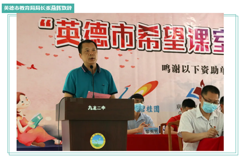 隨后英德市教育局局長張燕輝發表致辭。張局長首先感謝碧桂園•國強公益基金會和云蝶科技對英德教育事業的大力支持,對“希望教室”項目順利竣工并交付使用表示熱烈的祝賀。接著,張局長在致辭中指出,碧桂園•國強公益基金會和云蝶科技真誠地為英德教育事業獻愛心做實事,對英德教育的發展作出了巨大的貢獻,讓更多的農村學校從中受益,碧桂園•國強公益基金會和云蝶科技的善心義舉讓人敬佩。