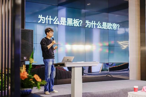 接下來就到了本次發布會的重點環節——新品發布。歐帝科技市場運營中心總監張青為大家現場揭曉歐帝新品:四代黑板、二代紅外一體機、智能講臺、6mm極窄雙屏、自研拼接屏等,并從用戶的角度分析歐帝新品如何提升教學體驗。