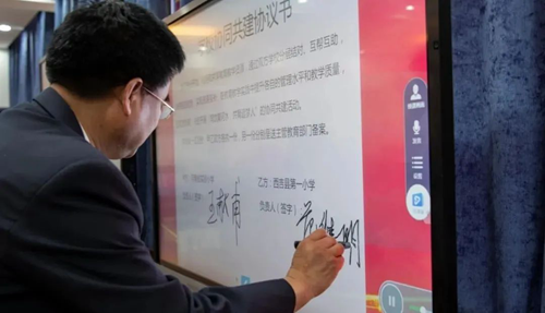 疫情之下,為了盡量避免人群聚集,做好疫情防控工作,并推動(dòng)此次簽約環(huán)節(jié)能夠順利進(jìn)行,河南省實(shí)驗(yàn)小學(xué)與寧夏西吉縣第一小學(xué)采用希沃交互智能錄播搭建云端互動(dòng)環(huán)境,以云上形式順利舉行座談會(huì)。通過希沃交互智能錄播設(shè)備和遠(yuǎn)程互動(dòng)助手,河南省實(shí)驗(yàn)小學(xué)的王獻(xiàn)甫校長在一體機(jī)進(jìn)行板書簽字時(shí),一千多公里外的寧夏西吉縣第一小學(xué)的范維明校長也可同步板書,真實(shí)還原現(xiàn)場(chǎng)簽約場(chǎng)景。