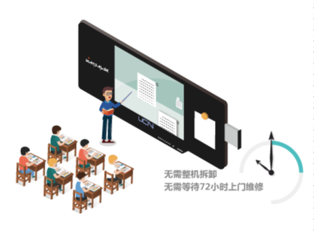 UCN納米智能黑板首創(chuàng)了E-box插拔設(shè)計,將易損部件全部集中到一個小盒子里,出現(xiàn)故障時,可在30分鐘內(nèi)解決,不耽誤教學(xué)進度。