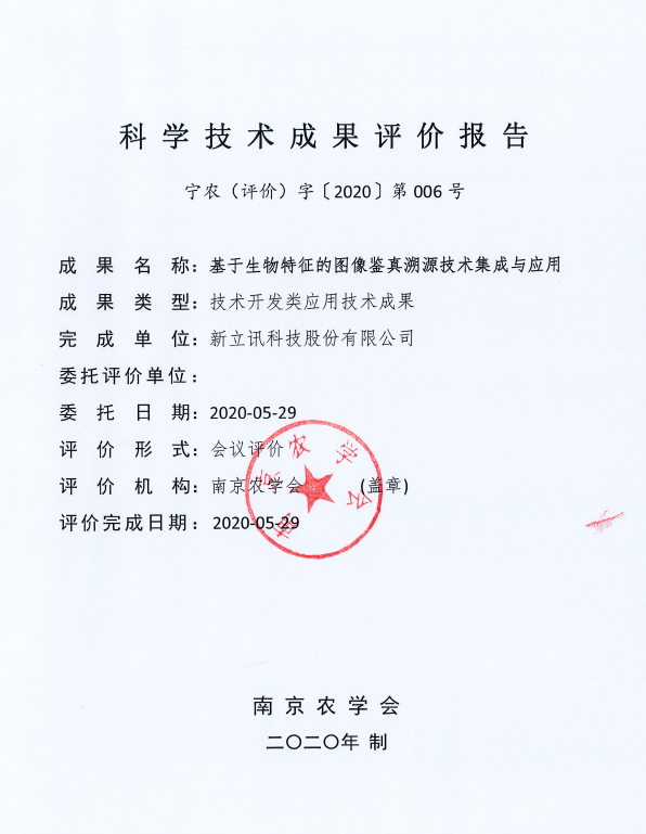 近日,新立訊科技股份有限公司自主研發(fā)的基于AI生物特征的圖像鑒真溯源技術(shù)集成與應(yīng)用取得由專業(yè)評審機(jī)構(gòu)南京農(nóng)學(xué)會組織的《科學(xué)技術(shù)成果評價》,技術(shù)先進(jìn)性達(dá)國內(nèi)外領(lǐng)先水平。
