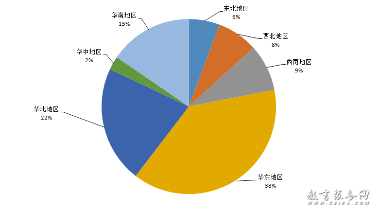 從6月份教育裝備中標信息地區統計圖(見圖8)和占比圖(見圖9)可以看出:華東地區中標信息量1052條,占全部信息量的38%;華北地區中標信息量591條,占全部信息量的22%;華南地區中標信息量422條,占全部信息量的15%;西南地區中標信息量236條,占全部信息量的9%;西北地區中標信息量207條,占全部信息量的8%;東北地區中標信息量156條,占全部信息量的6%;華中地區中標信息量69條,占全部信息量的2%。