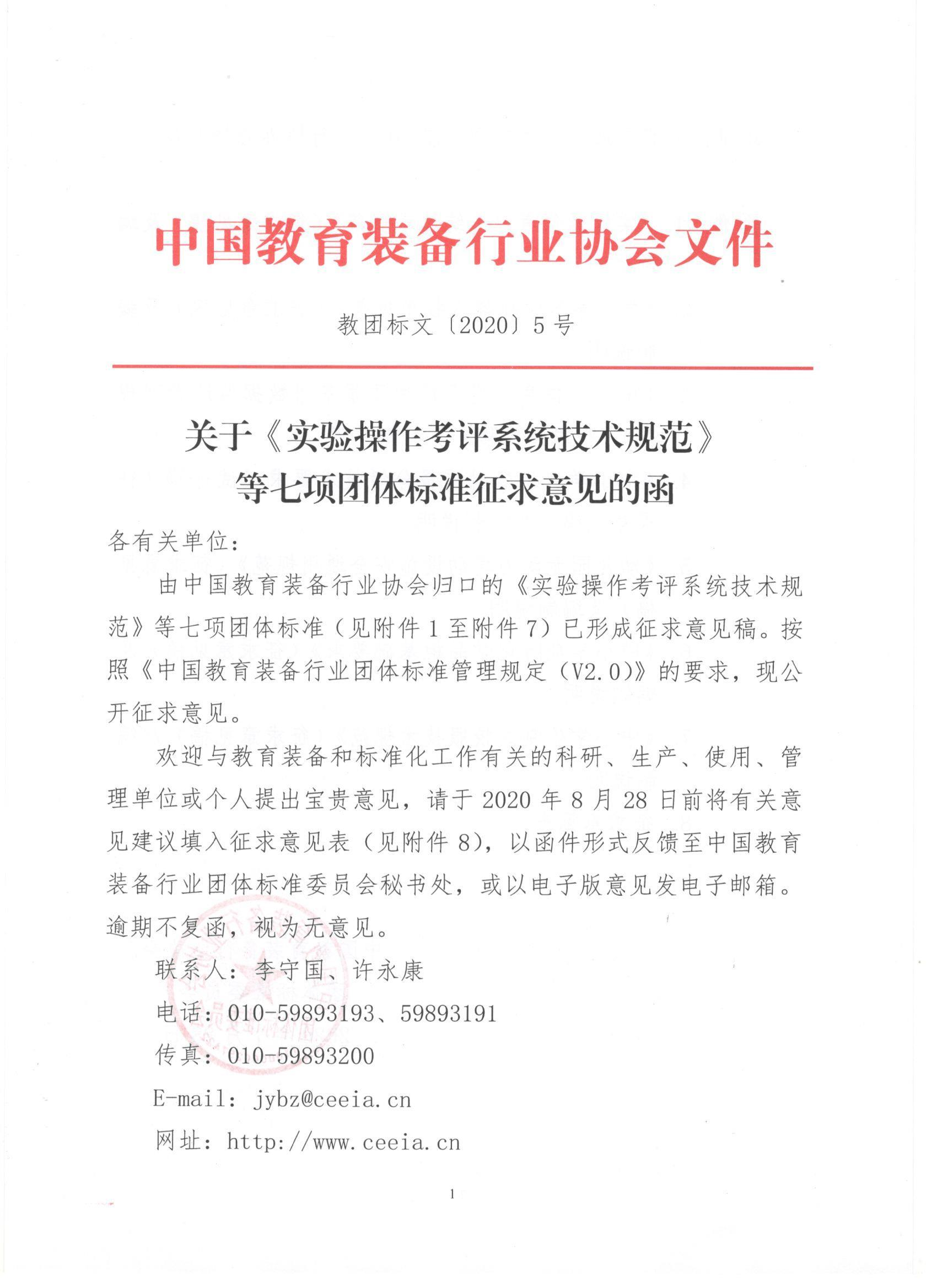 中國教育裝備行業協會團體標準委員會關于《實驗操作考評系統技術規范》等七項團體標準征求意見的函