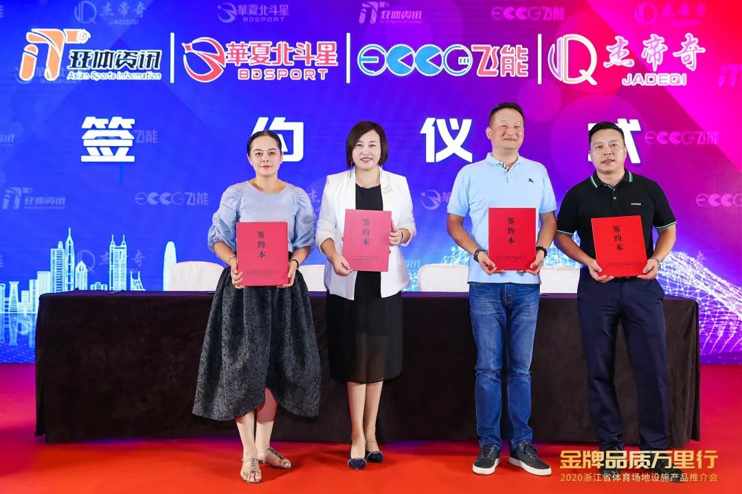 最后,四家公司共同簽下了「金牌品質承諾書」。四家中國體育設施行業翹楚企業,向浙江體育設施建設行業保證保質,等于立下軍令狀,表決堅守品牌的精神,用自身行動為中國牌增采,為浙江體育場地設施建設添磚加瓦。除了產品推介之外,廣東北斗星體育設備有限公司、河北杰帝奇體育用品有限公司、南京飛能橡塑制品有限公司與浙江亞仕麗體育文化發展有限公司(亞體資訊)進行了簽訂戰略合作協議。強強聯合,共同書寫體育場地設施產業新篇章。