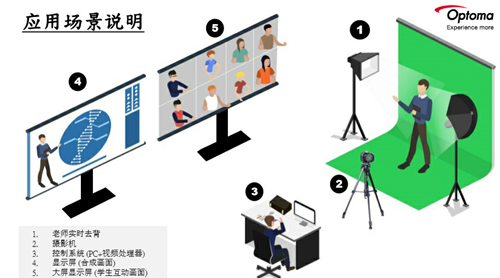 奧圖碼5G教學解決方案的應用方式是:教師在綠幕棚進行錄像 ,同時將影像傳輸到奧圖碼HQ Pro 1000影音處理器中,處理器也會將課程需要的的背景畫面、PPT簡報、3D畫面甚至AR影像與教師講課的身影融合,呈現出更加的沉浸的教學效果,然后實時將畫面傳遞到學生的屏幕上。