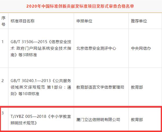 教育部推薦、國(guó)家市場(chǎng)監(jiān)管總局評(píng)選!立達(dá)信提出并起草的教育照明標(biāo)準(zhǔn)入選2020年中國(guó)標(biāo)準(zhǔn)創(chuàng)新貢獻(xiàn)獎(jiǎng)形式審查合格名單!