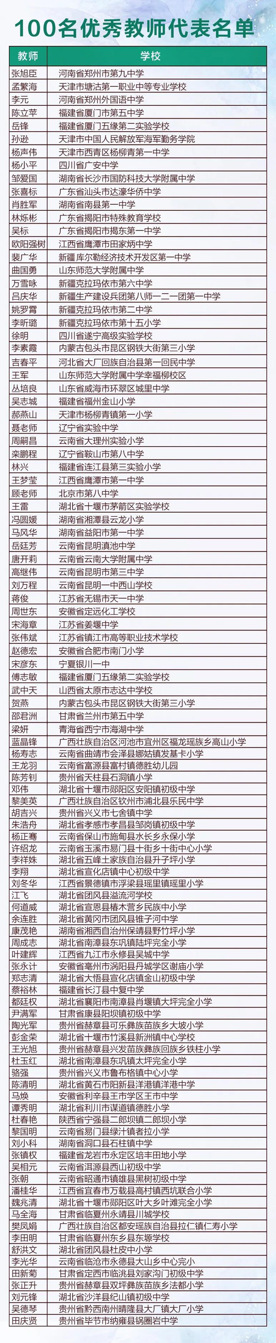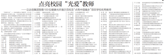 100位健康光環(huán)境示范校及“點(diǎn)亮中國(guó)偏鄉(xiāng)”項(xiàng)目學(xué)校優(yōu)秀教師代表如下: