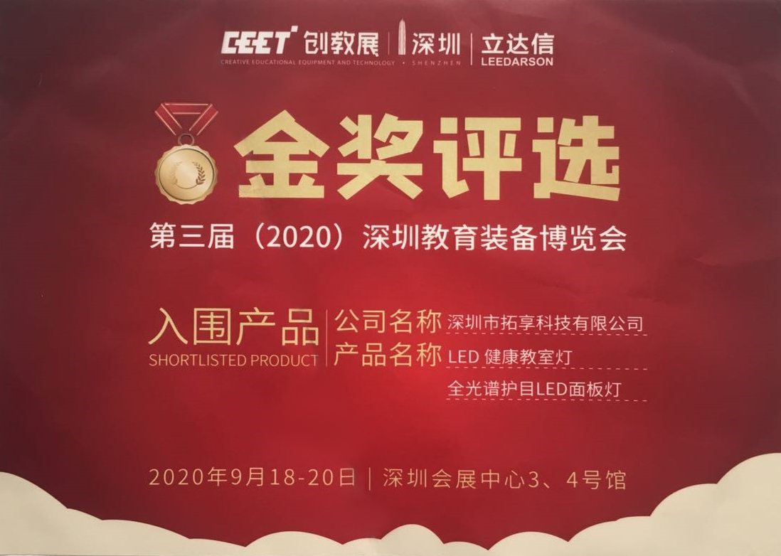 此外,拓享全光譜系列護眼燈具采用進口防眩光膜,擁有極佳的防眩效果,側面完全感受不到燈具發光,唯有燈下才能感受到,可以長時間直視光源而不傷眼。經過業界專家、學者的層層甄選,拓享LED健康教室燈及全光譜護目LED面板燈成功入圍“第三屆(2020)深圳教育裝備博覽會金獎評選”。