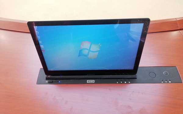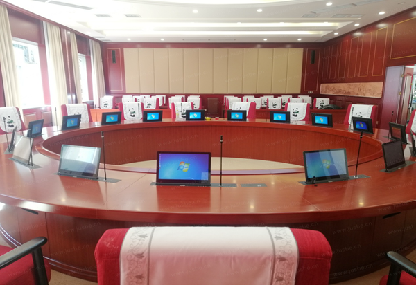 會議室圓形主席桌面無紙化系統,安裝的雙顯高清觸摸一體終端,自帶話筒升降和電子桌牌。開會時,與會者手指只需輕觸屏幕即可完成多項會議功能,原則上會議全程無需紙張。此套無紙化系統具備豐富會議服務功能,文件上傳、會議簽到、投票表決、資料查閱、電子白板、投影、文件批注、視頻播放等,極大提升會議效率。同時文件權限下載和資料加密的設計,能夠加強重要資料的高度保密性,避免泄露,既高效環保又安全有保障,完全滿足各種日常工作會議、保密會議、專題會議召開的需要。