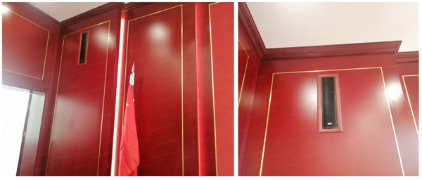 擴聲方面,以會議語言擴聲為主,側重考慮會議擴聲的清晰度、覆蓋面和聲音還原度。因此,會議室選擇的無源音柱,人聲中頻飽滿自然,高頻通透清晰,獨特聲柱擴聲設計,能夠提供更寬闊的聲音角度和更大的覆蓋面積,在場每一位聽眾都能獲得清晰的語言擴聲效果。考慮到整體的環境布局,音柱采取內嵌式的安裝,在不影響到擴聲效果的同時達到與會議室整體裝修風格相融合,提升視覺美感。