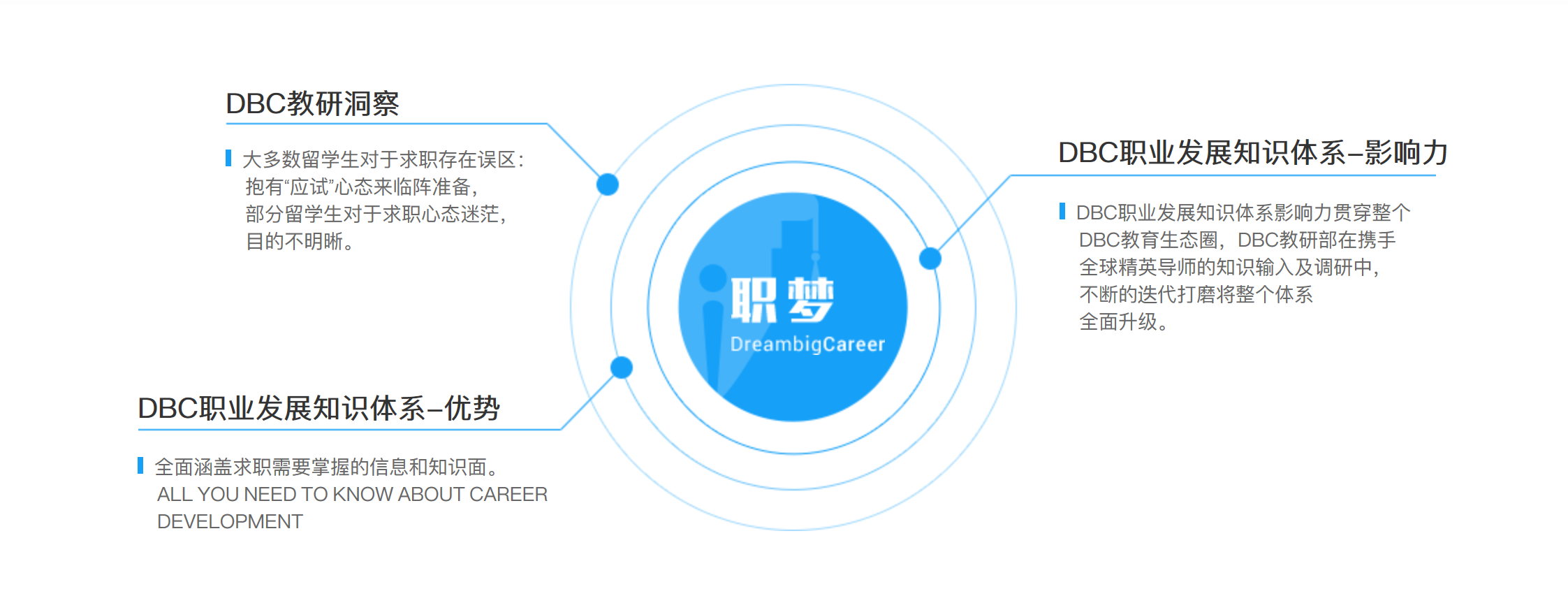 教育的核心關鍵在于人才的培養,發揮數據資源的價值、促進個性人才的發展是未來人才培養的重要趨勢。DreambigCareer職夢(以下簡稱DBC職夢)是博實樂教育集團旗下的專門從事留學生職業規劃的子公司,也是第一家擁有APP的留學生求職輔導平臺。職夢自主研發“移動求職學院”在線學習系統,專注于留學生職業發展綜合能力以及個性化發展能力培養與提升。2019年3月DBC職夢推出全新升級學習平臺——移動學院3.0,依托其官方APP、求職小蜜蜂、DBC學院、求職能力測評等微信小程序,以行業認知、求職技能、職業素養為核心課程模塊,匯集全球2000+精英導師資源,500+官方合作企業,有效構建了提升個人競爭力的全方位求職移動產品矩陣。
