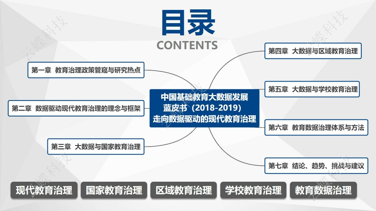 《中國(guó)基礎(chǔ)教育大數(shù)據(jù)發(fā)展藍(lán)皮書(shū)(2018-2019)》(以下簡(jiǎn)稱藍(lán)皮書(shū))共分為七章,分別從教育數(shù)據(jù)治理政策與研究熱點(diǎn)、理論框架描述了教育治理的發(fā)展以及數(shù)據(jù)驅(qū)動(dòng)的教育治理的框架。接著圍繞著理論基礎(chǔ)、實(shí)踐框架、案例分析、實(shí)施路徑等方面,分別從國(guó)家、區(qū)域、學(xué)校三個(gè)層級(jí)闡述了教育數(shù)據(jù)治理。最后,給出了教育數(shù)據(jù)治理體系、方法以及研究結(jié)論。
