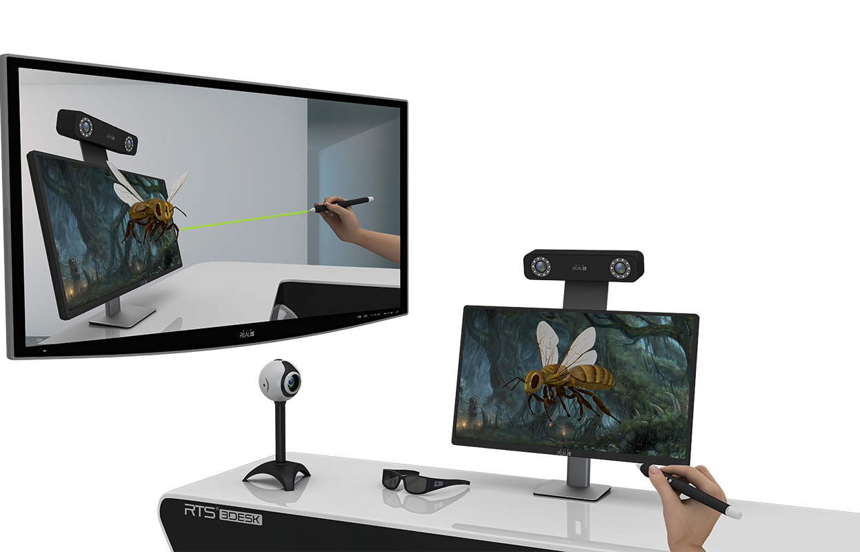 RTS-3DESK是全息3D智能立體交互系統(tǒng)應(yīng)用于桌面型3D交互的一種產(chǎn)品形態(tài),主要是基于RTS-DINO雙目紅外光學(xué)相機系統(tǒng)來實現(xiàn)三維定位,通過輕量級的交互筆對全息3D場景內(nèi)容實時操控,將3D顯示載體用桌面式3D顯示設(shè)備呈現(xiàn),從而構(gòu)建出一套可交互的桌面式全息3D顯示系統(tǒng)。