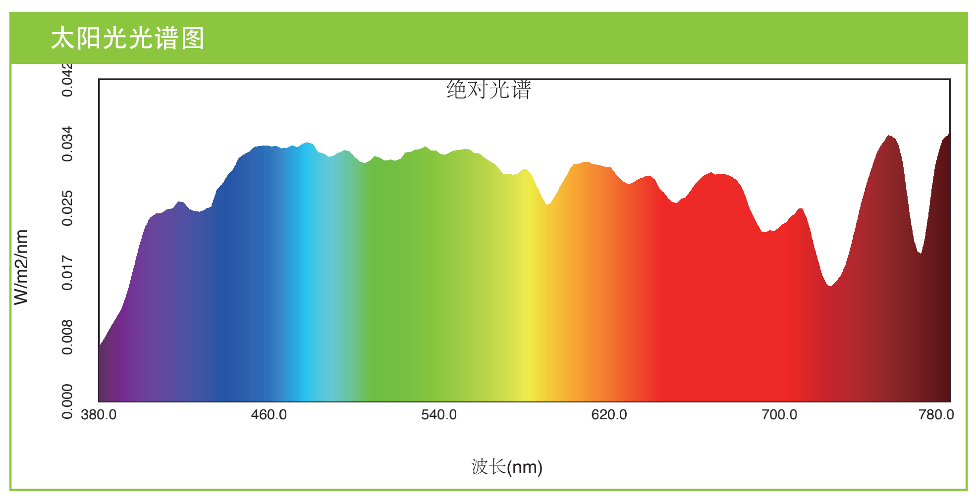 晴天中午的太陽光輻射連續(xù)光譜,色溫5000K,分為可見光與不可見光兩部分。可見光的波長為400~760 nm,分為紅、橙、黃、綠、青、藍、紫7色,集中起來為白光;不可見光兩種,波長大于760nm的紅外線以及波長290~400nm的紫外線。