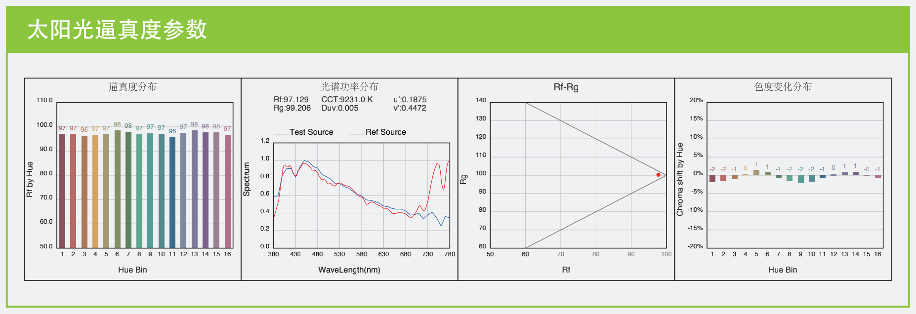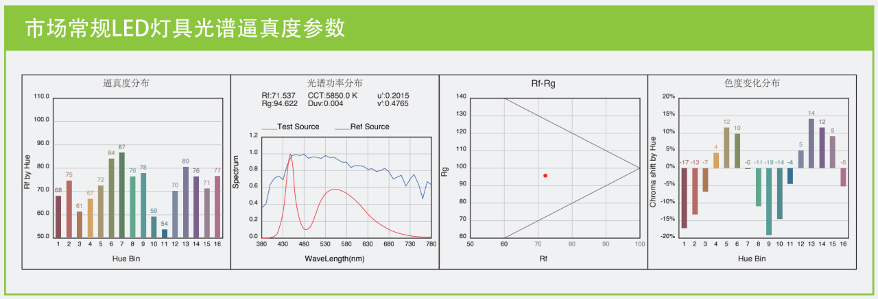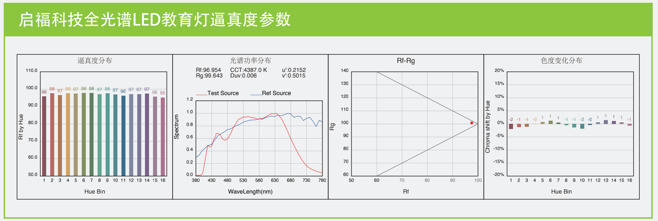 真正的全光譜健康照明系列LED燈具應(yīng)達到其顯色指數(shù)Ra97,色保真指數(shù)Rf96,色飽和度Rg接近100(IEC TM-30-15),同時實現(xiàn)高光效、高可靠性、低藍光、低紫光、無頻閃、無眩光、UGR不高于16的參數(shù)。