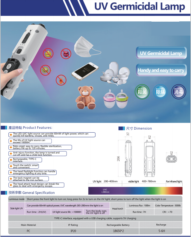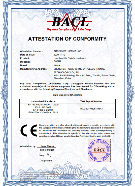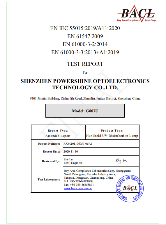 深圳鵬翔智明獲得手持UV LED殺菌燈EMC證書及廣微測測試報告