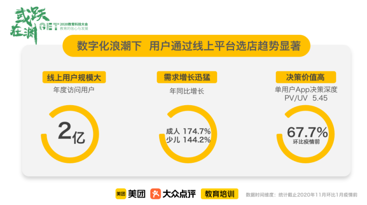 從今年11月環比1月疫情前,通過線上平臺來找線下機構的趨勢在大幅提高。這是有點反直覺的,但卻是實際發生的事情。全國有2億人通過線上平臺來找線下機構。同時,不同年齡的需求也有一定的變化,線上用戶對成人類教育培訓機構的需求同比增長174.7%,對少兒類教育培訓機構的需求也有114.2%的增長。此外,每一個人在線上找機構的平均數量也在發生變化,用PV÷UV,也就是在2億人中,平均每人一年要找約5.45家機構。