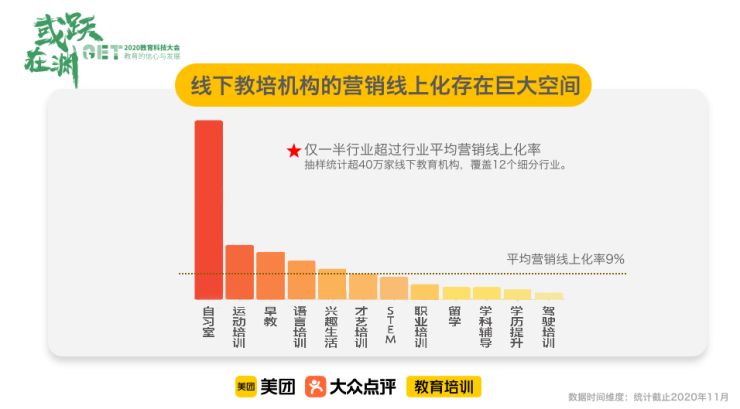 再來看目前中國教育行業的營銷線上化的水平,一個非常客觀的事實表明,真的會線上招生的機構只有9%,而越是新的行業,線上營銷的水平相對就越大。例如,在疫情中,最火的一個教育行業自習室,它的線上營銷的比例接近100%。但在線下已經存在20年以上的教育行業,例如駕駛培訓、學歷提升、學科輔導、留學等,可能還是更習慣于通過易業合作、發傳單,會議等線下手段獲取生源。