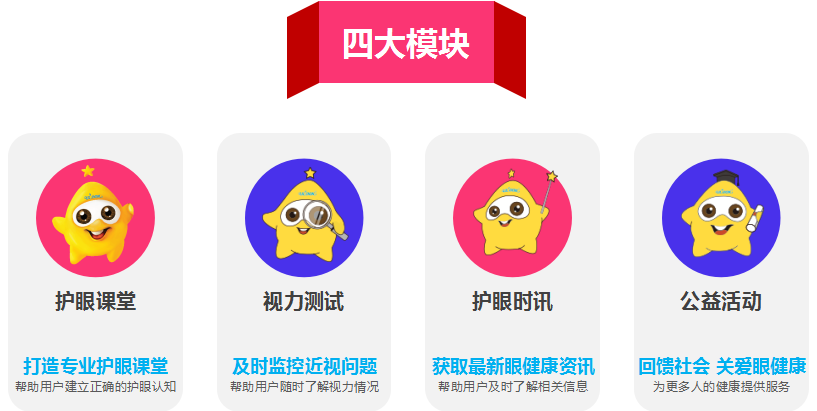 為了更好的深化科普效果,讓護眼科普從學校延伸到家庭,閃亮品牌專門研發線上護眼平臺“閃亮眼護理中心”小程序,其包含護眼課堂、視力測試、護眼時訊、公益活動等四大模塊,在線上通過科普+互動的形式,讓孩子和家長都能夠參與到護眼科普的互動中,這也是新時代科技護眼的創新體現。