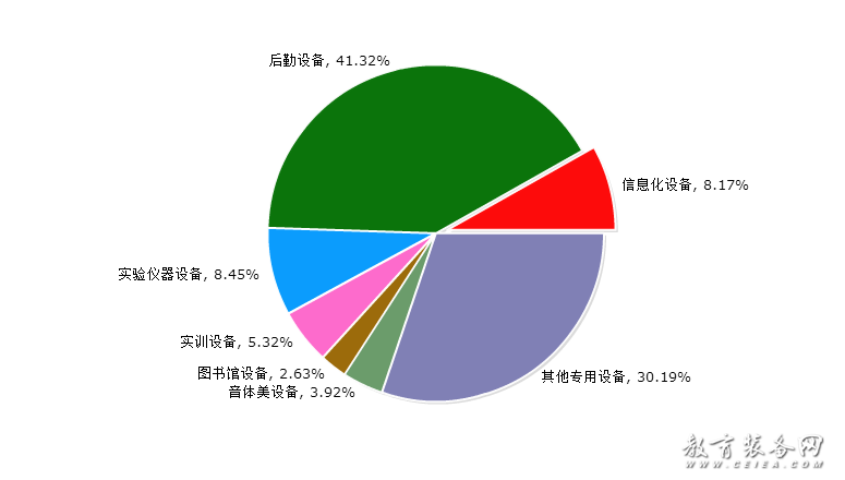根據對教育裝備細分的歸納,教育裝備網將教育裝備具體劃分為七大類,即信息化設備(含智能平板、錄播系統、智慧黑板等),后勤設備(含校園基建、安防設備、食堂設備、課桌椅等),實驗儀器設備(含儀器儀表、實驗室平臺等),實訓設備(含實訓系統、實訓設施等),圖書館設備(含借還系統、微型圖書館等),音體美設備(含樂器、體育設施、美術用品等),其他專用設備(含創客教育、心理健康特教設備等)。