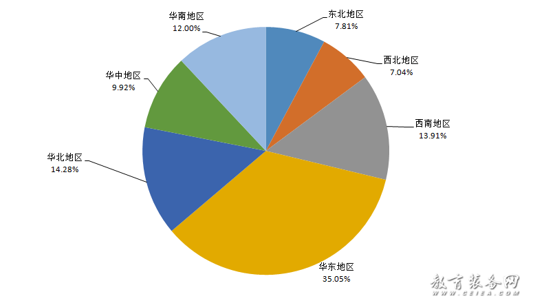 1月份教育裝備中標采購區域信息數據共2984條(中標信息區域設置為單選項)見圖6、圖7,華東地區中標信息量1046條,占區域信息量的35.05%;華北地區中標信息量426條,占區域信息量的14.28%;西南地區中標信息量415條,占區域信息量的13.91%;華南地區中標信息量358條,占區域信息量的12.00%;華中地區中標信息量296條,占區域信息量的9.92%;東北地區教育裝備中標信息量233條,占區域信息量的7.81%;西北地區中標信息量210條,占區域信息量的7.04%。