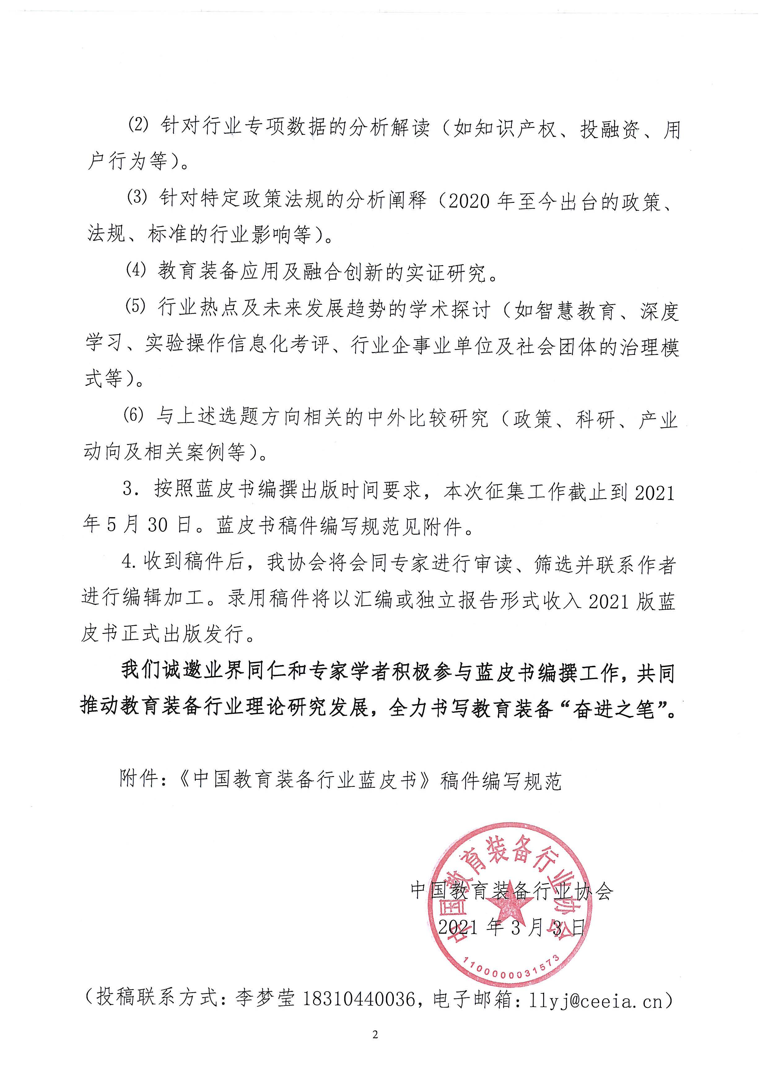 關(guān)于征集《中國(guó)教育裝備行業(yè)藍(lán)皮書(shū)(2021版)》專題研究報(bào)告稿件的函