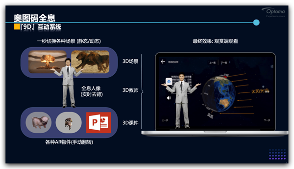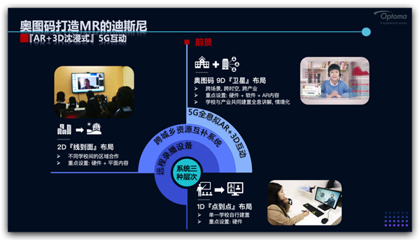 從最初的1D,到2D,遠(yuǎn)程教育不斷的發(fā)展,5G的到來,AR技術(shù)的不斷成熟,升級/優(yōu)化智慧化教育體系勢在必行,奧圖碼立志打造MR的迪斯尼,帶大家進(jìn)入9D智慧教育時(shí)代,具體細(xì)節(jié)將在本次論壇演講中進(jìn)行揭秘。