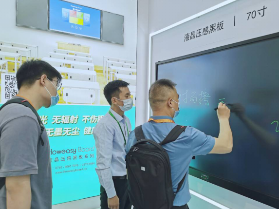 今天,多個(gè)省市的教育行業(yè)人士和客戶在好易寫展臺(tái)觀摩體驗(yàn)新品,與我司人員就液晶壓感黑板技術(shù)標(biāo)準(zhǔn)、功能參數(shù)和售后服務(wù)進(jìn)行了深入交流。對(duì)實(shí)際工程中的產(chǎn)品使用和維護(hù)存在一些疑問(wèn),我司現(xiàn)場(chǎng)專業(yè)人員就此進(jìn)行了一一解答和現(xiàn)場(chǎng)演示。現(xiàn)場(chǎng)人士對(duì)液晶壓感黑板產(chǎn)品給予了高度評(píng)價(jià),希冀好易寫能盡快實(shí)現(xiàn)對(duì)70寸的產(chǎn)品定型和量產(chǎn),抓住信息化變革的春風(fēng),一起把服務(wù)智慧教育的工作做好、做實(shí)。