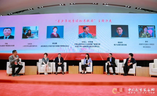 閱讀沙龍環(huán)節(jié),由中國出版協(xié)會少兒閱讀推廣聯(lián)盟主席、中國少年兒童新聞出版總社原社長李學(xué)謙主持,邀請人民文學(xué)出版社副社長王秋玲,海峽出版發(fā)行集團副總經(jīng)理何強,接力出版社副總編郭樹坤,成都市天涯石小學(xué)昭忠祠分校校長黃彬,超星集團有限公司副總經(jīng)理劉煥閣為嘉賓,圍繞“青少年優(yōu)秀讀物進校園”主題作交流分享。