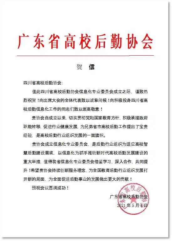 江蘇省、山東省、廣東省、山西省等學校(高校)后勤協會也對四川省高校后勤協會信息化建設專業委員會的成立發來賀電賀詞。