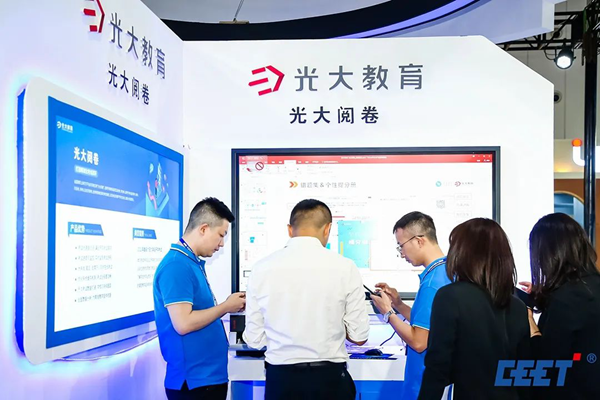 光大教育在教博會上展示了“光大閱卷”、“在線考試”與“紙筆互動課堂”等產品!肮獯箝喚怼、“在線考試”已上架釘釘平臺,系統與釘釘組織架構完全打通,管理員、老師、學生、家長通過釘釘平臺直接進入系統,考試、閱卷、查成績、查看分析報告一站式完成。