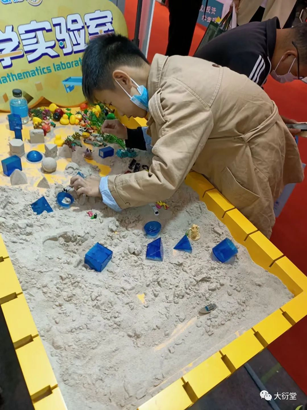 現場的小伙伴為參展人員耐心詳細地講解大衍堂的數學實驗理念與綜合實踐解決方案,例如,以大衍堂首創、獨立研發的核心教具數學實驗沙盤桌,通過沙盤提供一種數學教學方式,將抽象的問題具象化、復雜的問題簡單化,在沙盤中搭建模型,建立場景,用可視化教學為廣大教育工作者解決實際問題。
