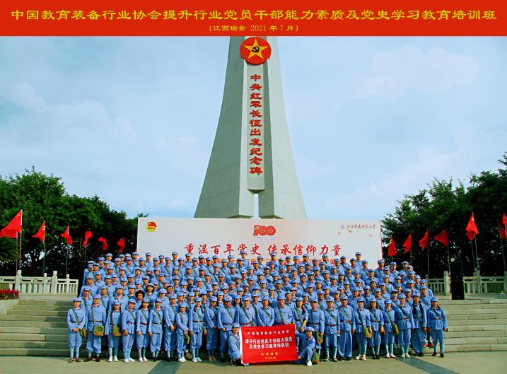 2021年7月11—12日,中國教育裝備行業協會(以下簡稱協會)在江西瑞金舉辦了2021教育裝備行業提升干部能力素質及黨史學習教育培訓班。全國各省區市教育裝備行業黨員代表共220余人參加了培訓班。本次活動旨在組織行業黨員跟著紅色地標學黨史、傳承紅色基因、汲取奮進力量,不斷鞏固和夯實黨的執政根基。