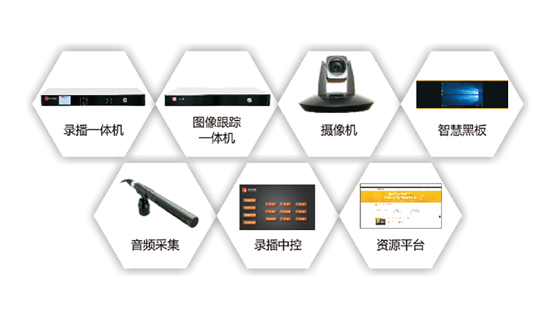 本方案由錄播一體機、圖像跟蹤一體機、攝像機、智慧黑板、音頻采集系統、錄播中控系統、教學資源管理平臺等產品組成。
