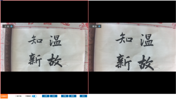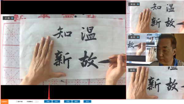 書畫教學(xué)展示臺(tái)由3臺(tái)攝相機(jī)組成,正面和側(cè)面攝像頭分別從正上方、左上方對(duì)書寫過程進(jìn)行拍攝,特寫攝像頭正前方對(duì)教師授課進(jìn)行怕拍攝,支持手動(dòng)調(diào)焦。 |