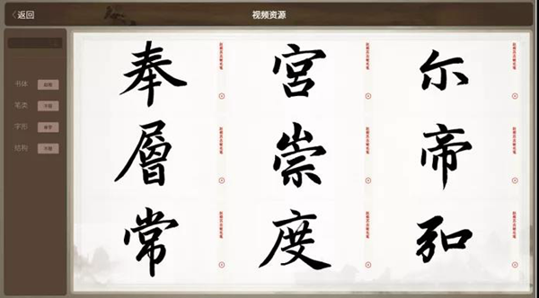 (2)左側(cè)搜索框輸入單字或集字進(jìn)行搜索,可根據(jù)書(shū)體、筆類、字形、結(jié)構(gòu)進(jìn)行搜索。