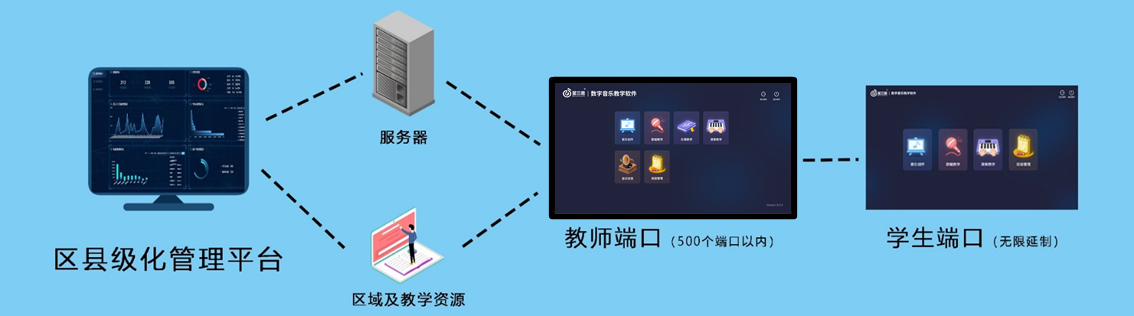 數字化音樂教學平臺是通過區/縣的服務器,建設區級/縣/校級教學平吧,結合配套教學內容,輔助區/縣或學校開好、開齊音樂課,讓孩子享受優質的教學資源,更好的提升孩子音樂知識水平,推進區/縣或學校的美育素養發展。