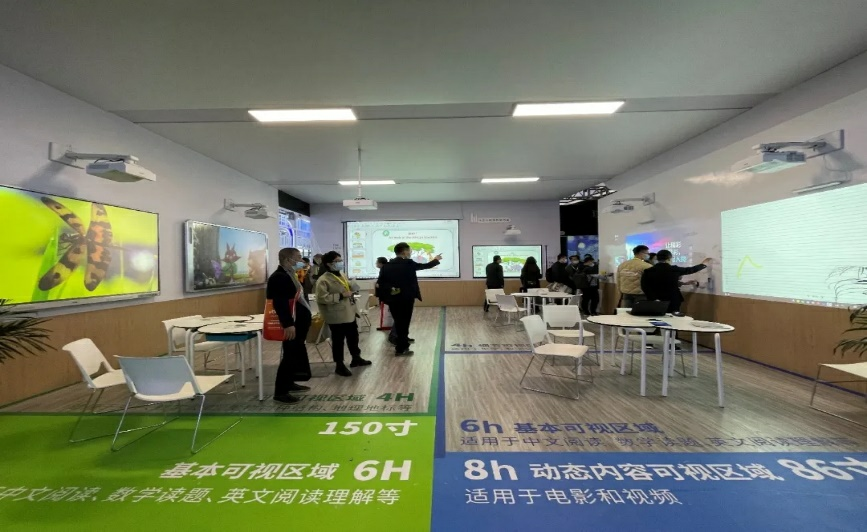 愛普生此次打造的重點方案——“低藍光智慧教室”由主屏和多個小組屏組成。主屏區采用一大一小雙屏幕的設計,大屏幕是由7000流明*1的激光工程機新品CB-L730U和150英寸電動幕*1組成,小屏幕則是由激光超短焦投影機CB-735F和86英寸電子白板*1組成。之所以主屏區要采用一大一小雙屏幕的設計,是因為愛普生希望通過更加直觀的畫面大小對比,讓觀眾了解到不同尺寸屏幕所適合的可視距離。顯而易見,更大畫面適應更遠可視距離,令坐在教室后排的同學也都能輕松看清屏幕內容。