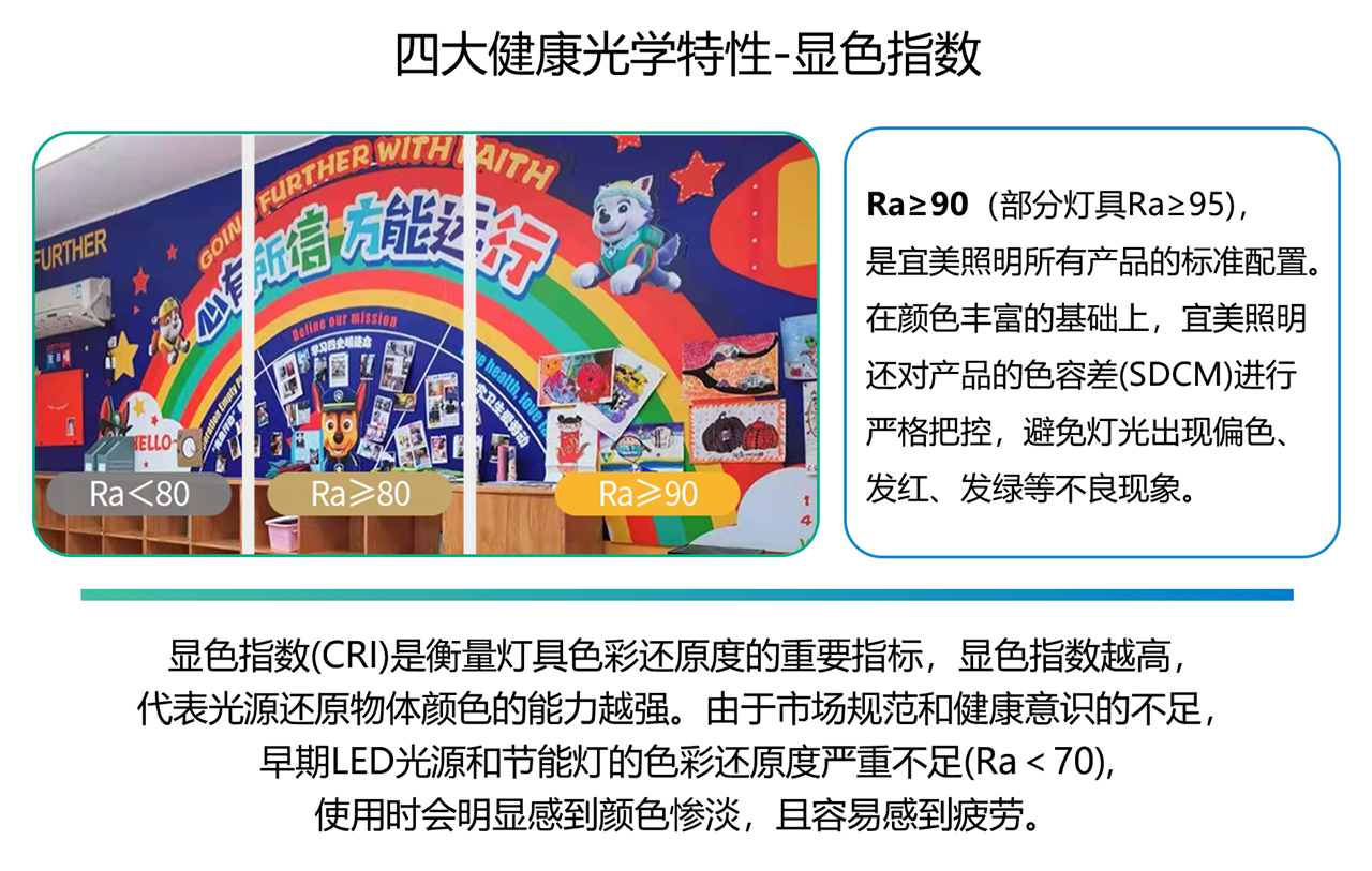 青少年的健康成長是一個嚴肅的話題,卓越的品質也是宜美照明不容妥協(xié)的追求。自宜美照明進駐國內(nèi)市場以來,所有的燈具產(chǎn)品便具備了“4+2”,品質“4+2”是宜美照明獨創(chuàng)的品質理念,其中包含“高顯色性、無可視頻閃、防眩光、無藍光、長壽命、高安全性”。為此,宜美照明的一百余位設計師和工程師不懈努力,為國內(nèi)市場研發(fā)了一系列品質超前、技術領先的教育、商用和家居燈具產(chǎn)品。