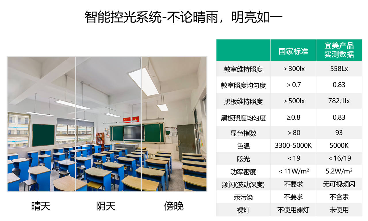 宜美照明的黑板燈和教室燈能夠通過傳感器實時感知教室內(nèi)的光照條件,使得課桌和黑板的照度維持恒定,這樣既能避免亮度過低造成視覺疲勞,又能避免強光反射刺眼。