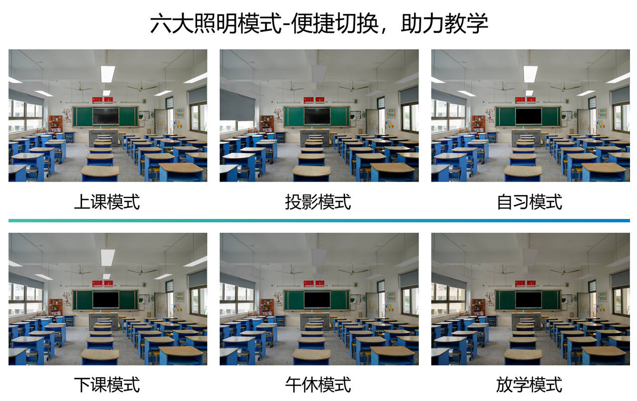 除此之外,這套智能照明系統(tǒng)提供了6種布光模式,在上課模式下重點照亮黑板和課桌,幫助影學生幾種注意力;在投影模式下,黑板燈會通過降低亮度避免幕布眩光;在下課和放學模式下,照明系統(tǒng)會降低全局亮度,營造適合休息的輕松氛圍,同時避免無謂的能源消耗。